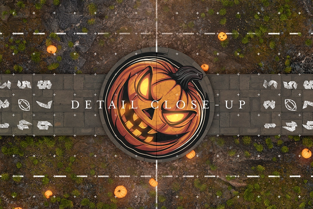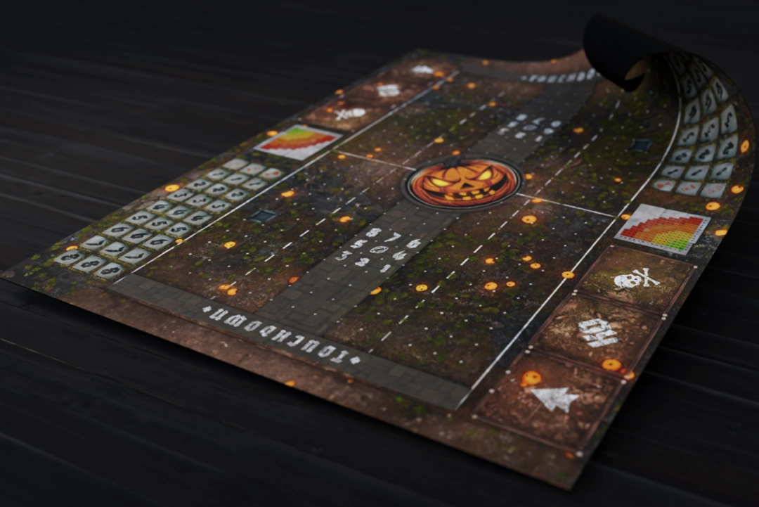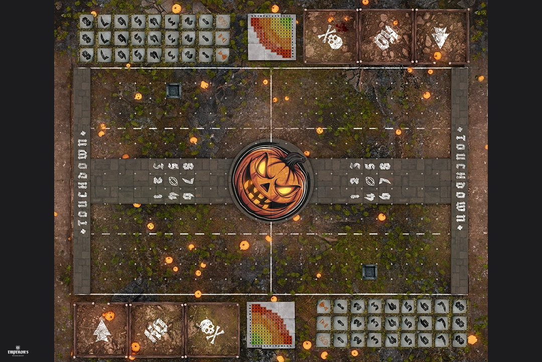 Hallows Eve-themed neoprene gaming mat for Fantasy Football. It features dugouts, a range chart, and useful tracking tiles. *These mats do not have a rubber backing. Avoid folding to prevent crease lines and damage to the mats.